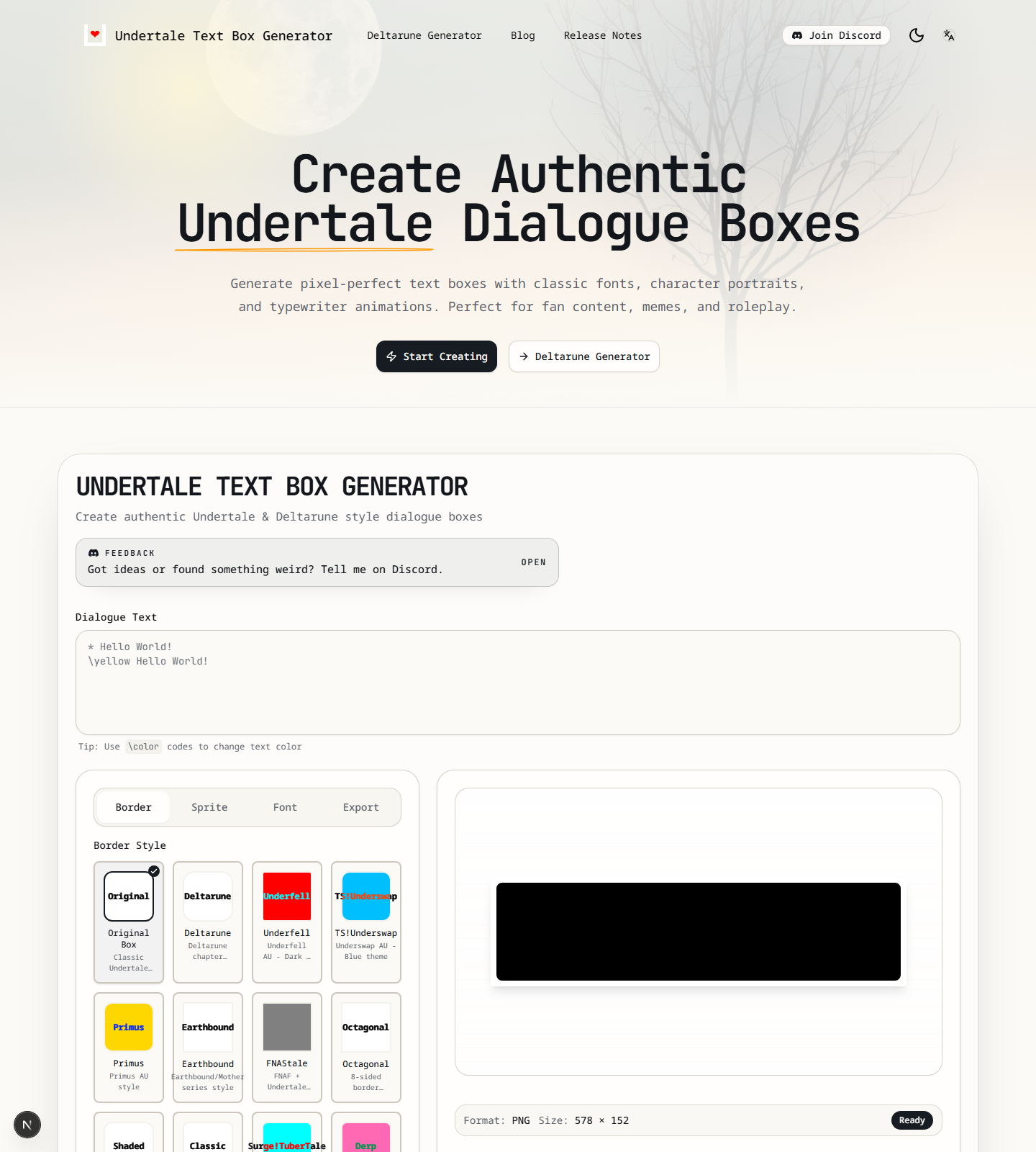 The current editor gives you one browser-based workflow for Undertale-style and Deltarune-style dialogue boxes: